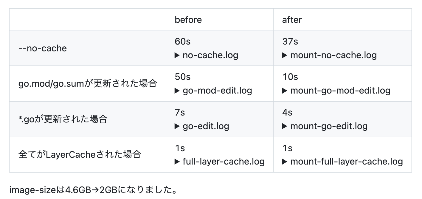 私が所属するプロジェクトのある image では、Bind/Cache mounts を導入したことでビルド時間が大幅に改善しました。