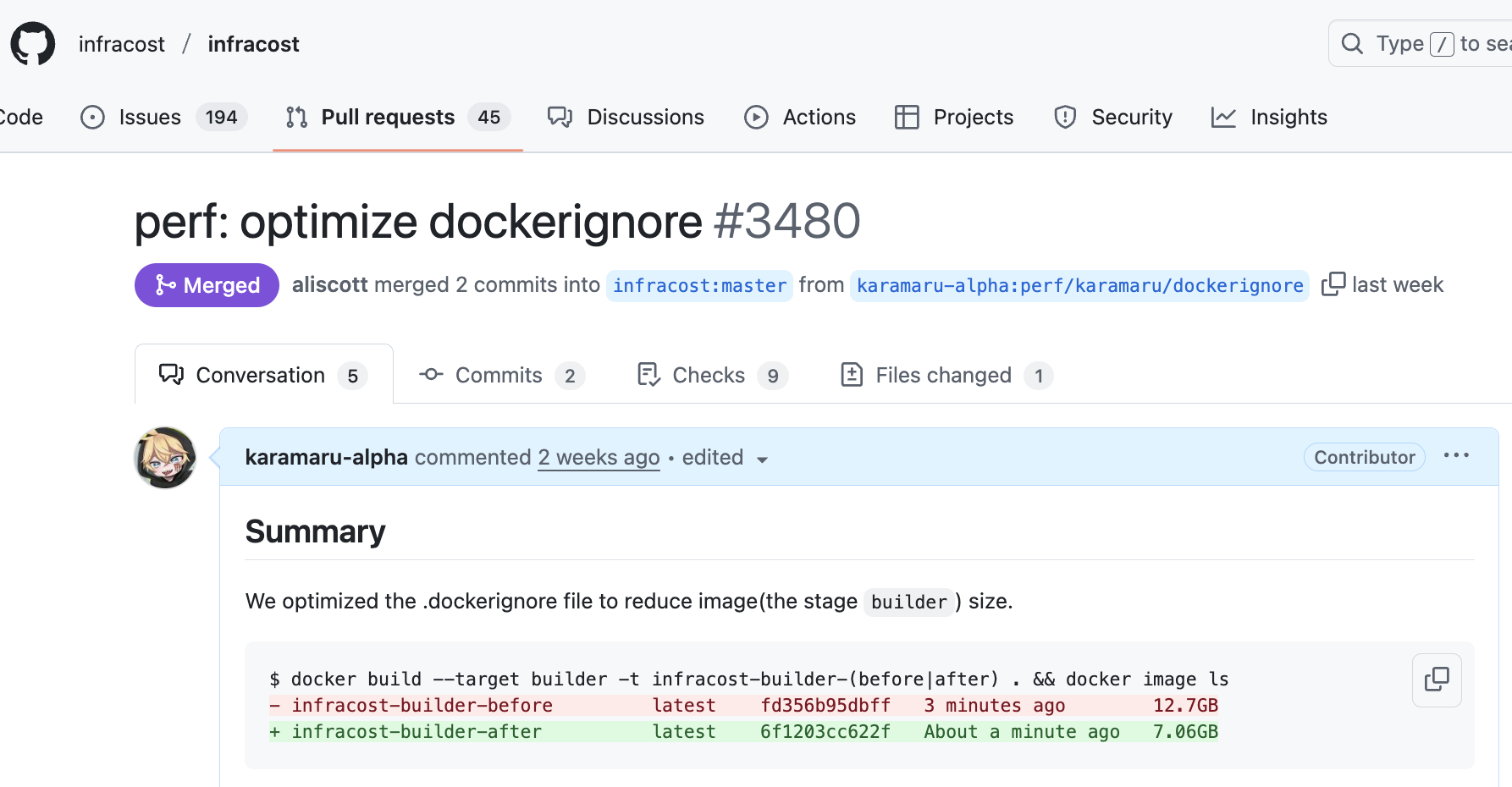 上記 PR もdive ${image_tag}の結果を参考にしたもので、COPY . .で本来必要のないtestdataディレクトリが余計に容量を圧迫していることが分かりますね。