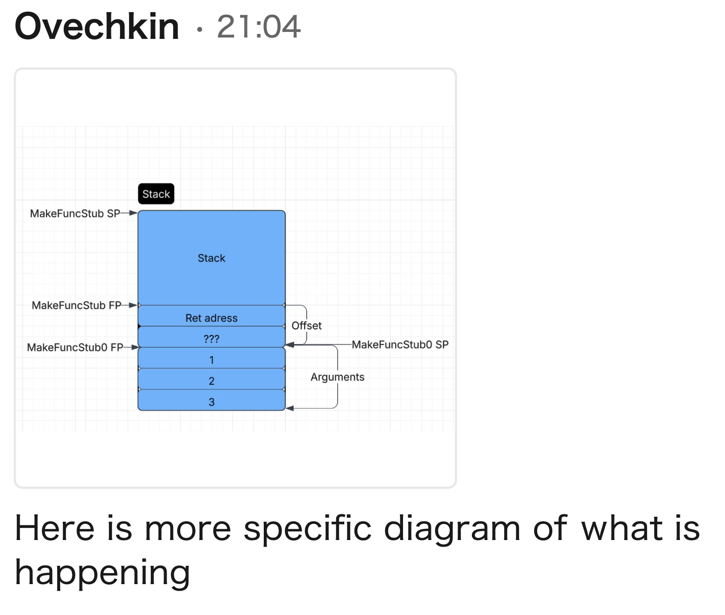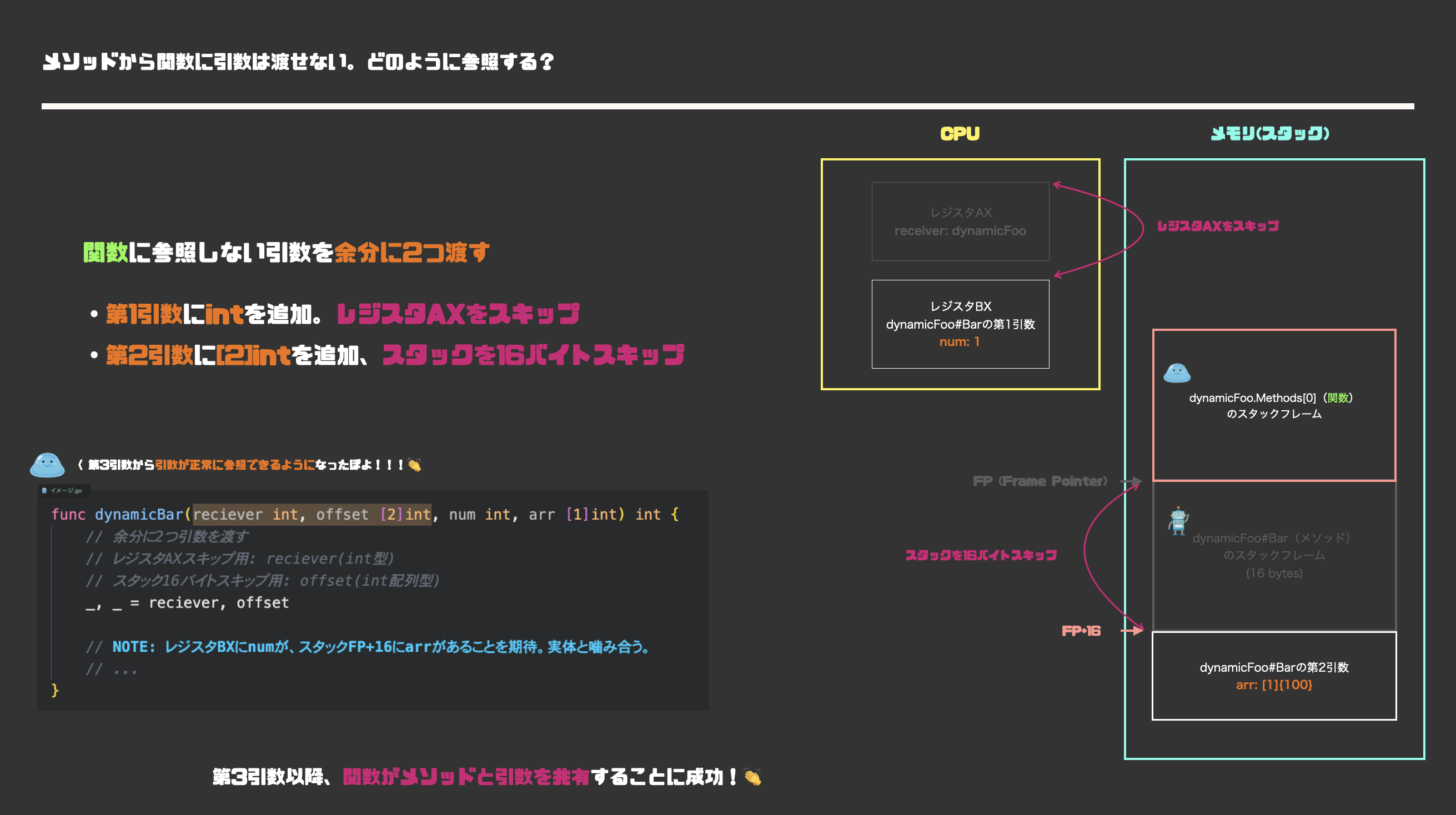 主に関数とメソッドで引数を共有するトリックについて、引数のレジスタ・スタック割り当てを利用していること、スタックが連続した時の FP の offset が 16 バイトになることを丁寧に教えてくれました(16 バイトの部分は OS や Go バージョンにより異なりビルドタグで制御される)。