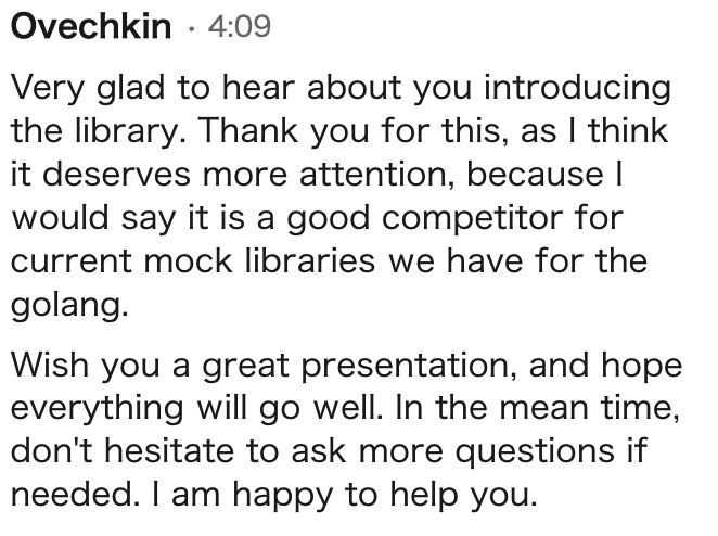「コード生成をせずにモック処理を行えるあなたのライブラリが好きだ。内部処理をこのように理解してるんだけど、ここだけ理解できないから質問してもいいかな?」みたいな感じでダメ元で連絡しました。すると、 1 日も立たずに返信をいただきました。