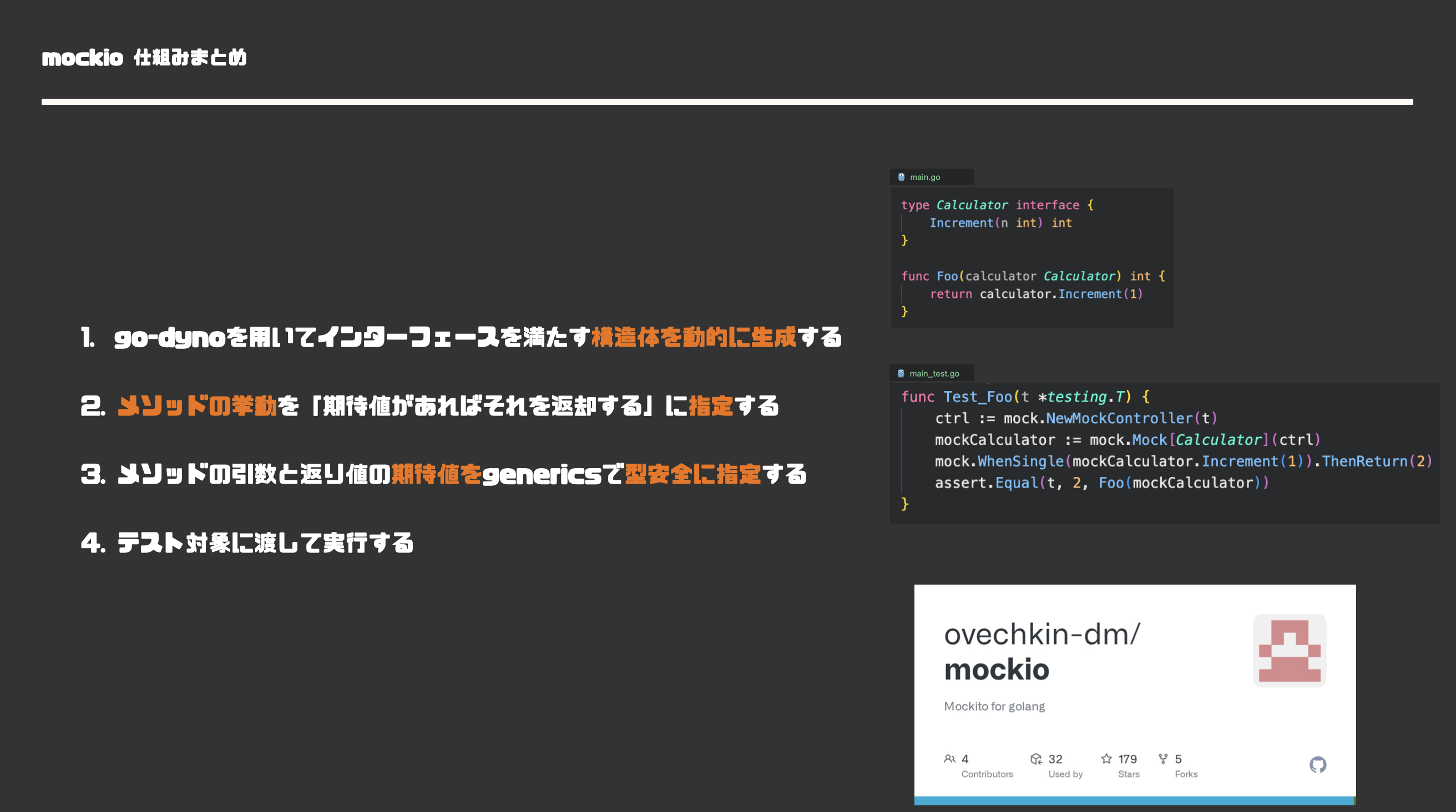 なので発表資料では、そもそもモックってどういうことだっけ?という話から、既存モックライブラリの内部実装を自作してイメージするところまで解説しています。