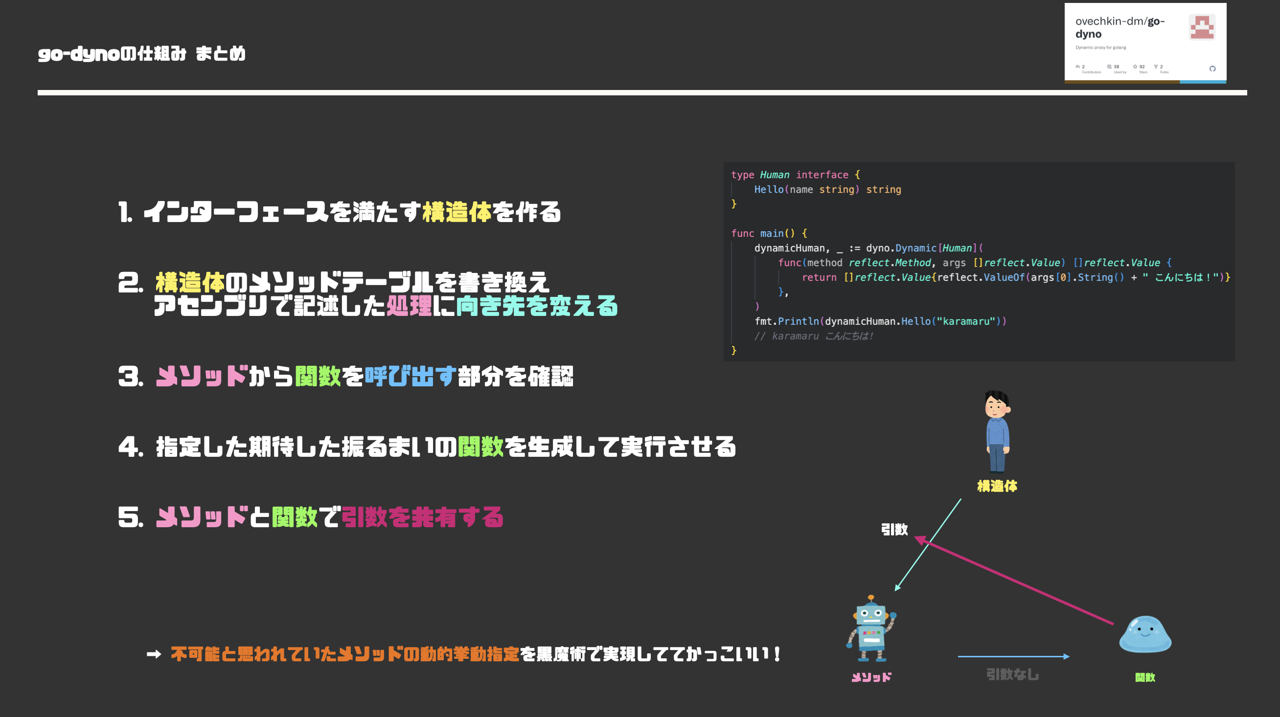 ふんわり中身を見てみると、go-dynoというライブラリが構造体・メソッドの動的生成を実現していることが分かりました。動的に振る舞いを変更できるなんてメタプログラミングみたいでかっこいい!そう思い調査を開始し、CfP にこのテーマを選択しました。