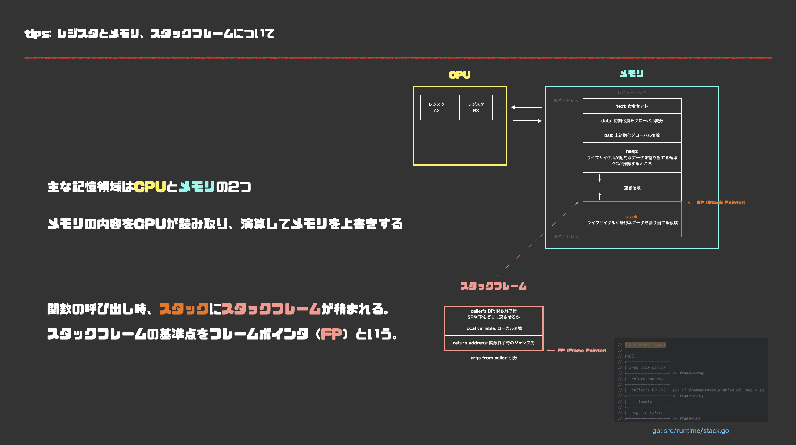 メソッドって Go でどう管理されてる?レジスタとスタックの違いは?アセンブリってどう書く?関数とメソッドの違いは?スタックフレームの構造は?引数の受け渡しってどうやる?… これらを Tips パート(タイトル赤線のスライド)として紹介しました。