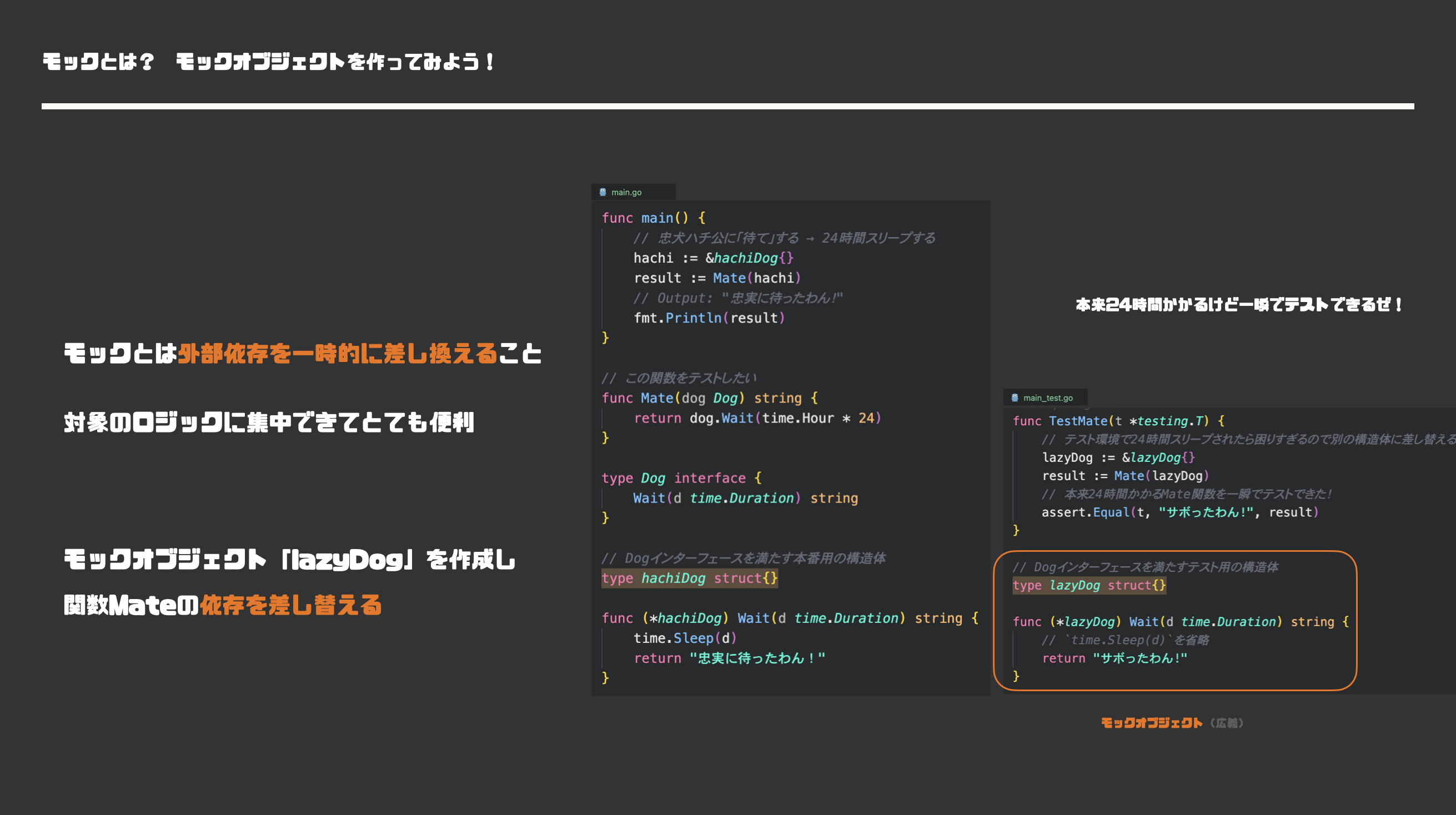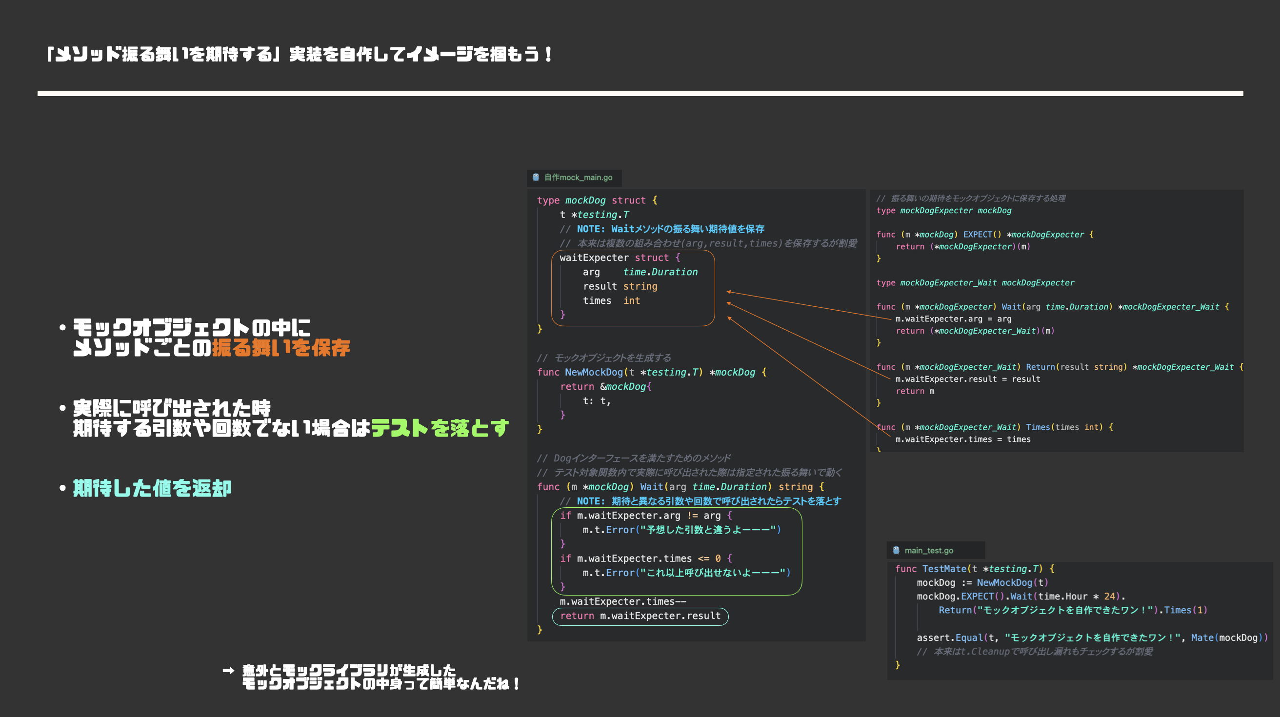 なので発表資料では、そもそもモックってどういうことだっけ?という話から、既存モックライブラリの内部実装を自作してイメージするところまで解説しています。